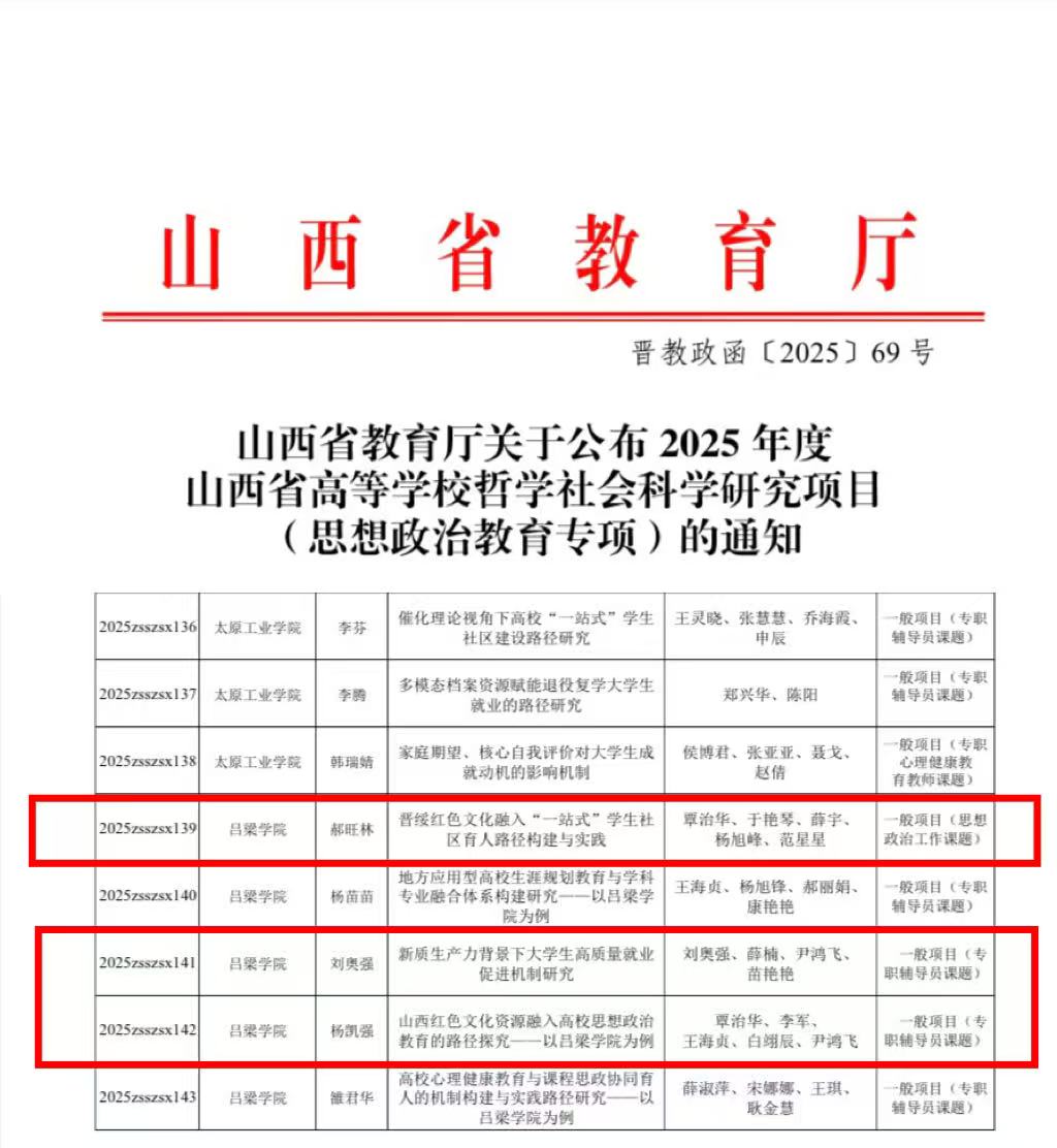近日,山西省教育厅正式发布了《关于公布2025年度山西省高等学校哲学社会科学研究项目(思想政治教育专项)立项结果的通知》(晋教政函〔2025〕69号)。我系学生工作队伍申报的3个项目获得立项批复,其中思想政治工作课题1项,专职辅导员课题2项。